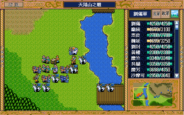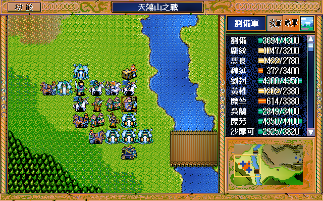 我 刘辟右二下二援助、刘封右下援助、黄权右交援军报告给刘辟,糜芳上激励、马良右下援助黄权,刘备右二上二援助、张飞左下激励刘备,庞统下牵制、魏延原地攻击步兵2,糜竺原地激励、吴兰下援助糜竺,沙摩可左下焦热书骑兵2;