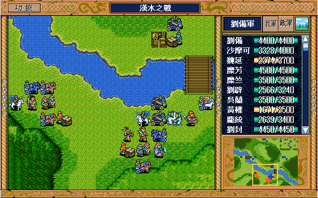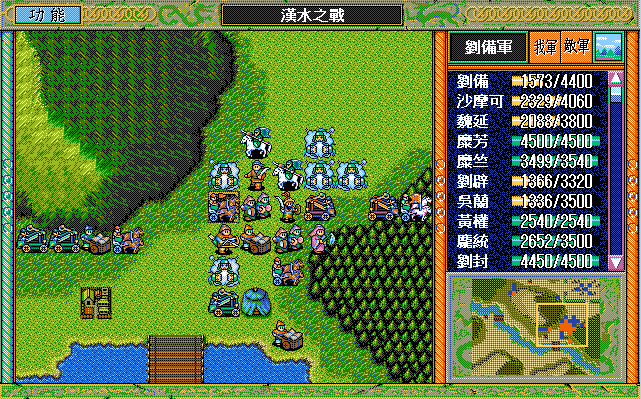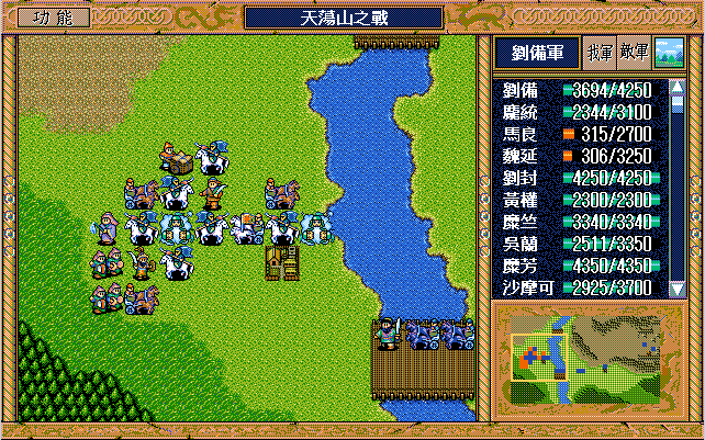 我 吴兰右二下一,魏延左一上一开始大火龙(本回合伤害步兵5),沙摩可上一开始(后不说明都是)大漩涡(本回合伤害步兵5,伤害步兵4二回合),庞统右二上一大火龙(二回合,本回合伤害步兵5),王平右二上一援助、糜竺上激励(从此不变位置)、刘封进宝物库援助王平(并拿1000金),糜芳进鹿砦援助、马良下方两格补给魏延,黄权右激励糜芳(从此不变位置),张飞左激励马良,刘备右下假情报曹洪,刘辟左四上一;