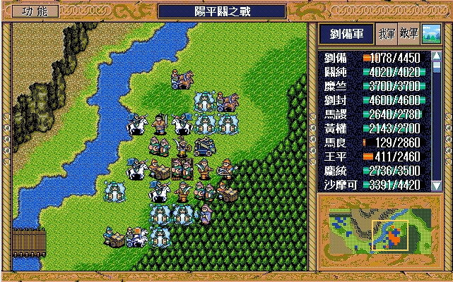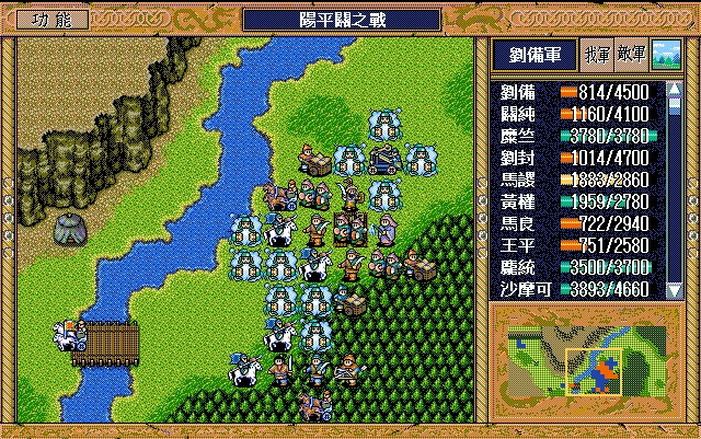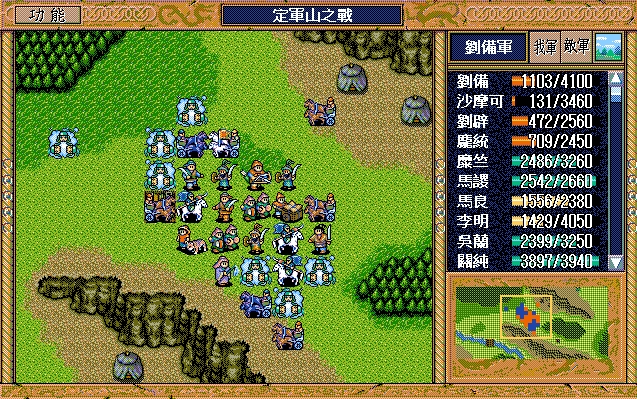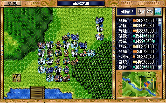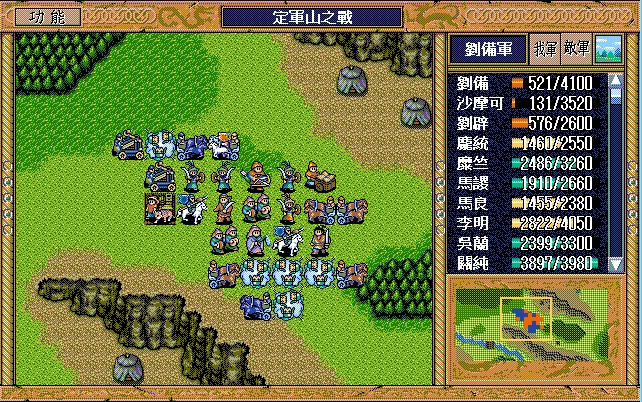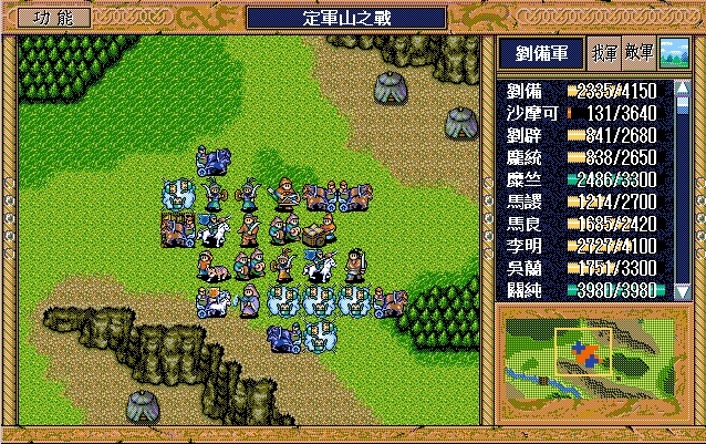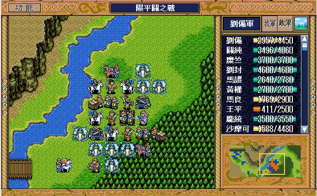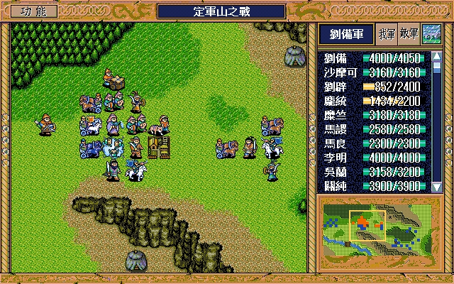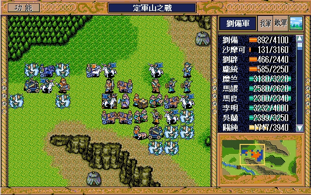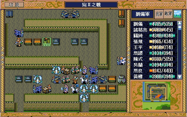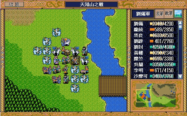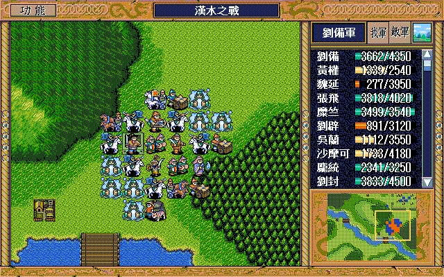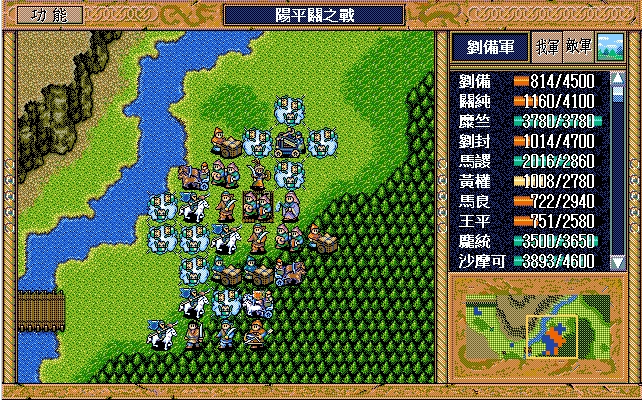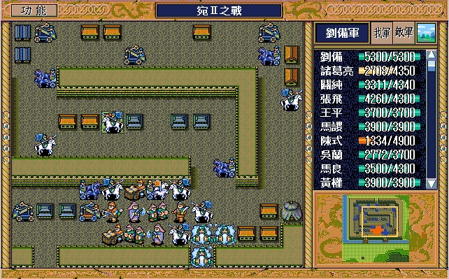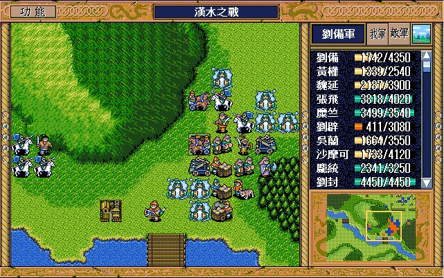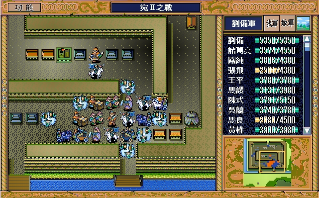 刘备(英雄之剑、4麦、猛火书);沙摩可,刘辟(赤兔马、援军报告),庞统,糜竺(浓雾书),马谡,马良,李明,吴兰(的卢),关纯,刘封,赵云,魏延(焦热书)