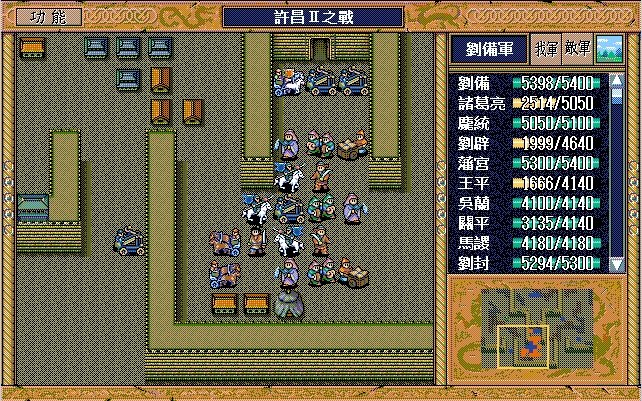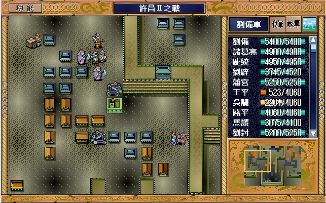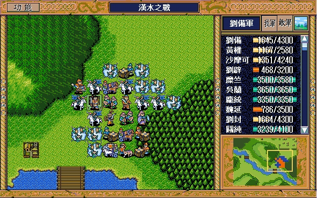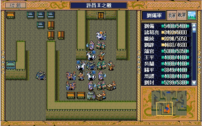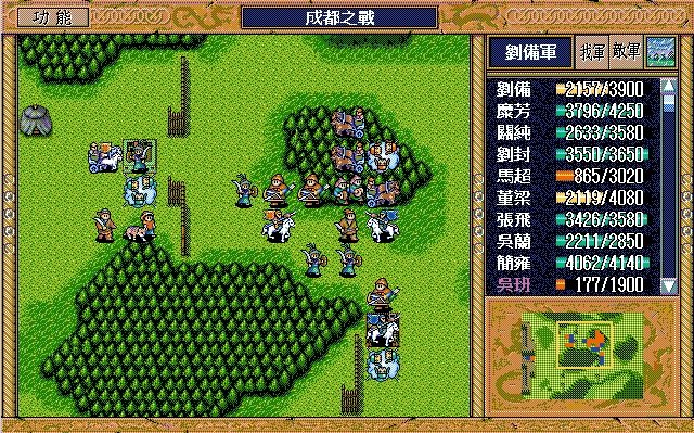刘备(七星剑、援军报告),诸葛亮;庞统(剑术指南书、长枪),刘辟,藩宫(赤兔马、英雄之剑、马术指南书、马铠、近卫铠),王平,吴兰,关平,马谡(六韬、剑术指南书),刘封,关羽(三略、豪雨书、马术指南书、马铠),陈式(的卢、青釭剑),马良