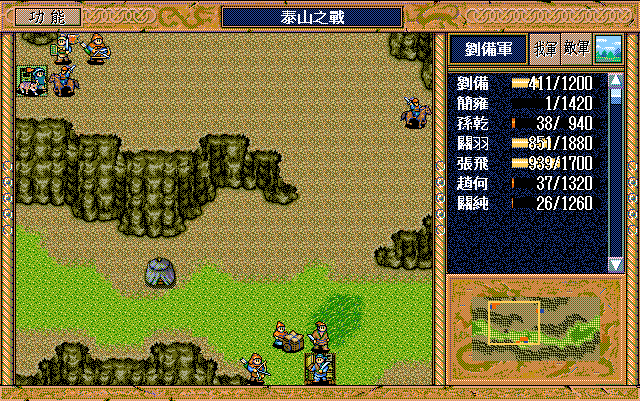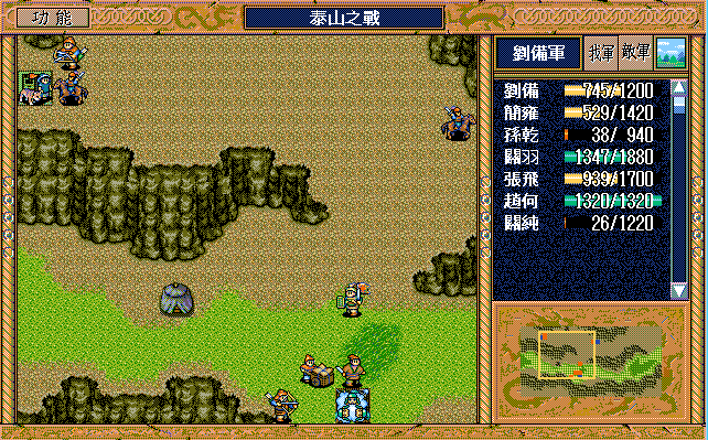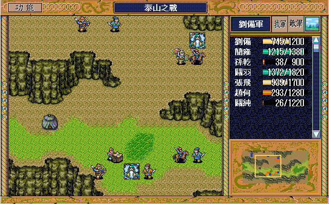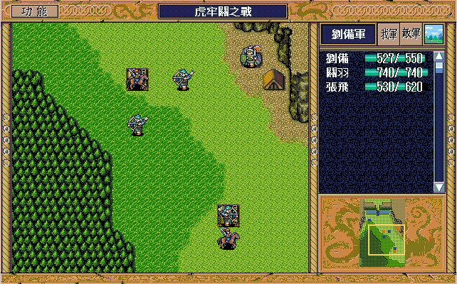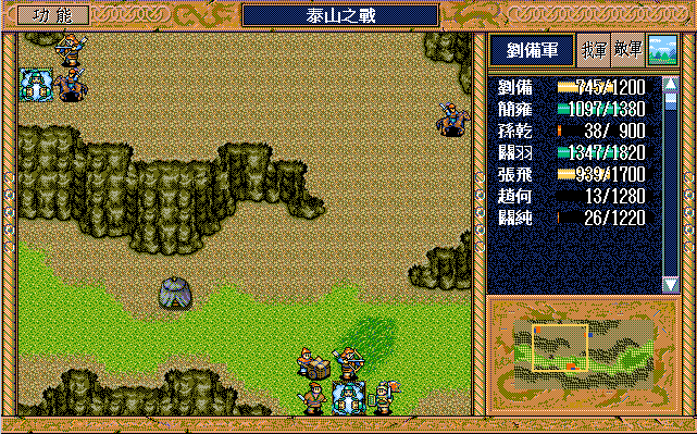 我 张飞开始右攻击武术家2(28回合兵力余10),简雍左上、关纯右下攻击消灭贼兵3,关羽右四下二,刘备右一。