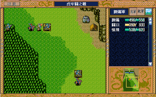 我 简雍右激励张飞,张飞休息,关纯左方两格攻击消灭贼兵2,关羽左上激励关纯,刘备左四;