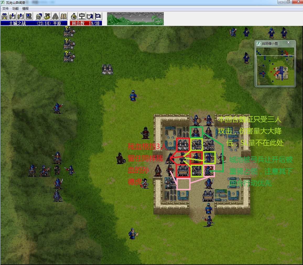 (3)管毅血量蹭到85~87(87是孙德虎站在120%地形能秒杀管毅的血线,不建议低于85,因为孙德虎实际伤害浮动在58~64,而弓兵在城内攻击管毅的面板伤害是24,留一点SL余地比较好)。