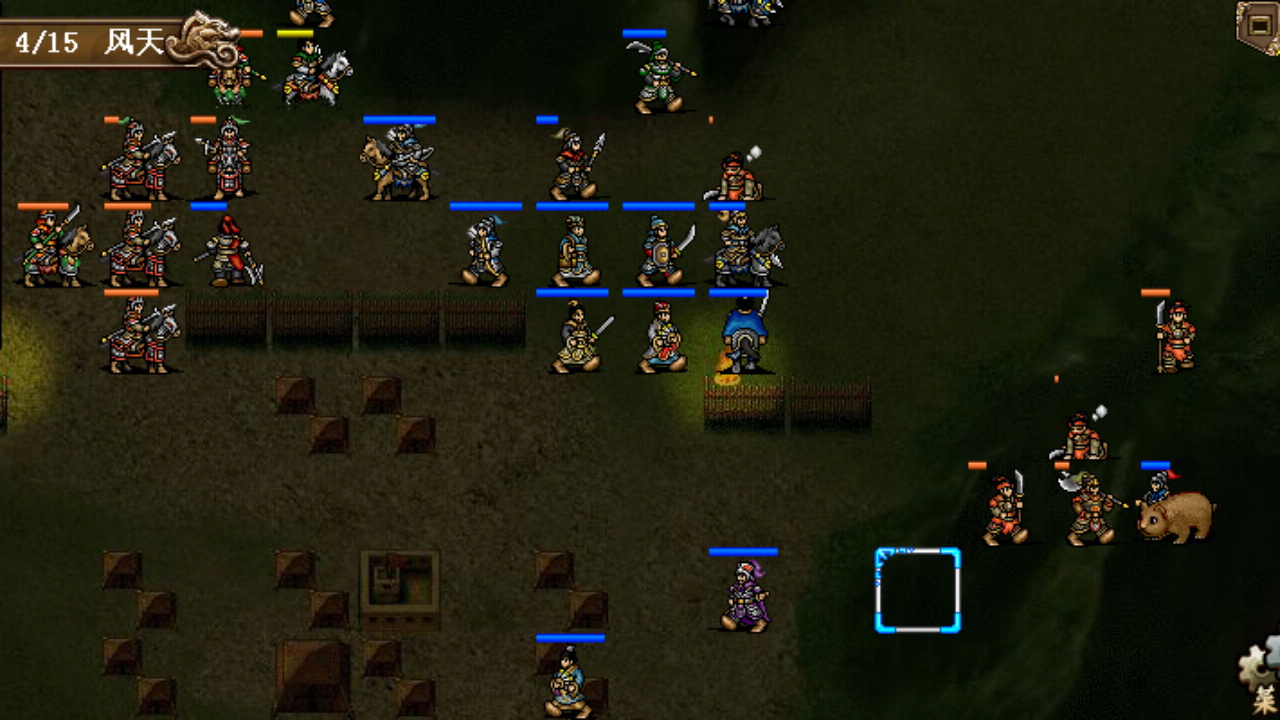 街亭总回合有25回合,难度不大,考虑到和下面的子午谷是连关,装备配置方面可以更多为难度较大的子午谷倾斜,基本上把具有二次移动能力的武将和装备都留在子午谷。城外的部队一路杀过去,城内的武将挤在鹿砦兵营防守反击,18回合全灭过关。