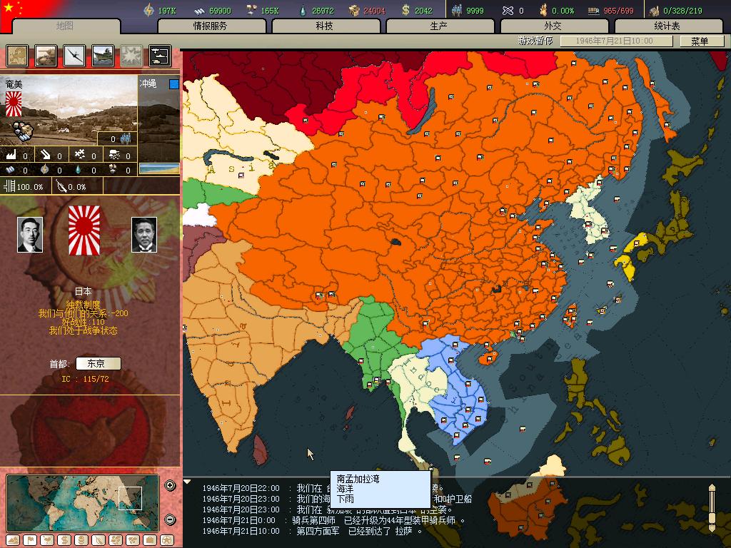 然后努力发展科技,油只能靠和米国搞好关系整了, 43年日本宣了美国,开始侵入中南半岛,与英军对抗.