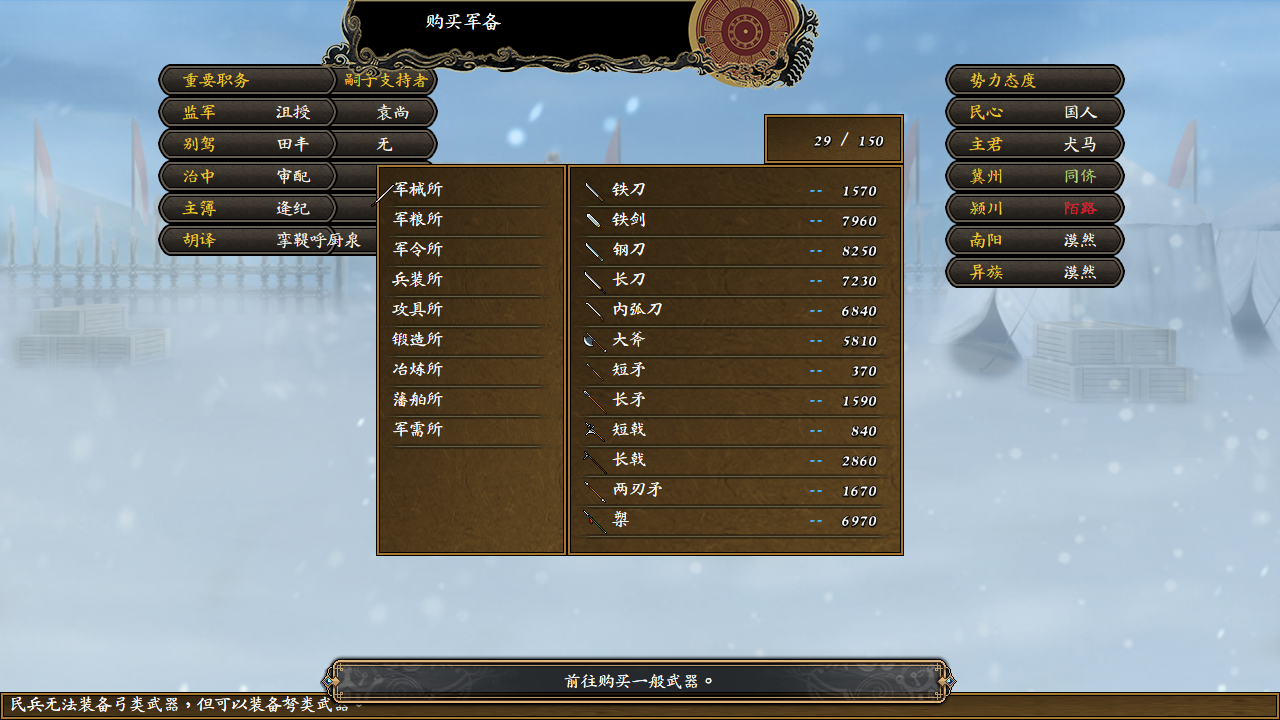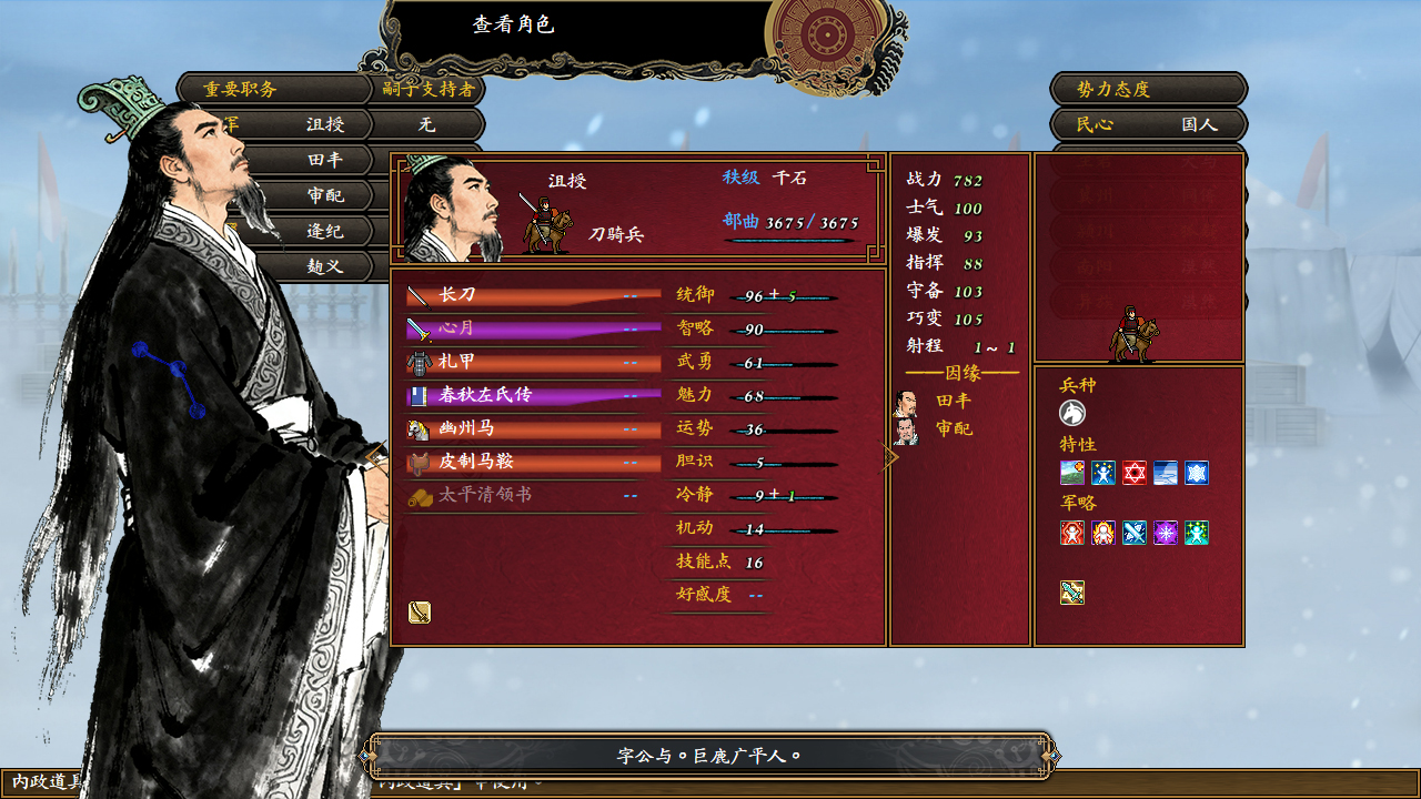 内政与微政治模拟:作为人臣,您将不得不费心在所属势力的主公与各个派系中寻找平衡,培养重臣与其它同僚间的人际关系。如果势力态度过低,该势力所属角色可能会有各种负面事件,抑或直接离开队伍,并影响剧情走向;而主公并非对你完全信任,更不太可能对你言听计从。是逢迎上意或是犯颜直谏?是说服敌手或是利益交换?是委屈求全或是坚持己见?一切皆在您的一念之间,而这些选择无不关系到您最后能否力挽狂澜。