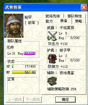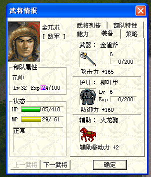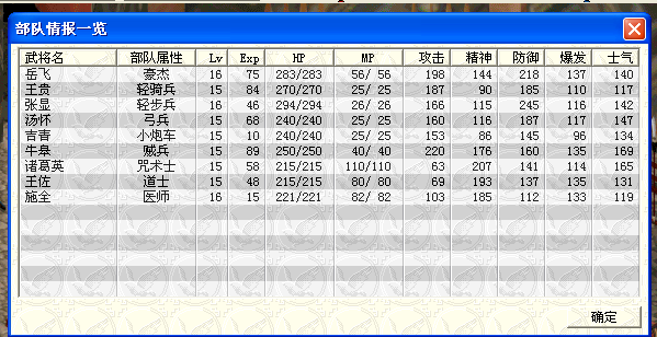 心得:1.按常规战法很难全员6级以上,故通过尽早引出牛皋,攻击牛皋引他反击,使牛皋能升到6级甚至7级,然后汤怀等人攻击牛皋才能获得更多经验值。