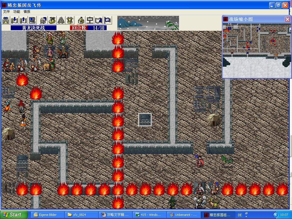 第13回合友军阶段,几个贫血挡路的铁华车,被韩世忠一起风掉。韩彦直几个人合力干掉粘得力(粘得力进入平原后,只有90%,友军肯定会先选择打他,而不是铁华车;90%的粘得力,韩彦直可以打他300多点HP)。同时,大部队攻破中央的关卡。岳飞靠精忠报国和乌骓马,冲进去,秒掉普风!这时陈抟出现,指点阵眼,由于哈迷蚩此后开始自由移动,必须混乱掉他。
