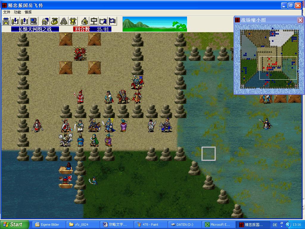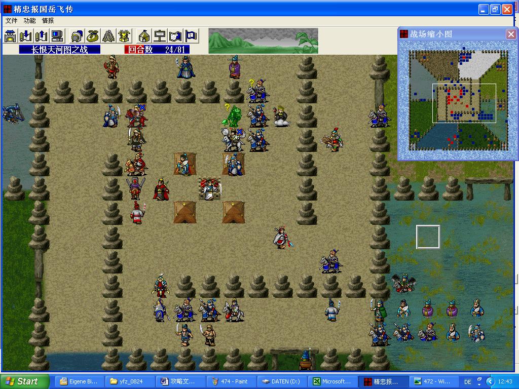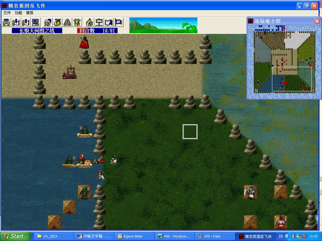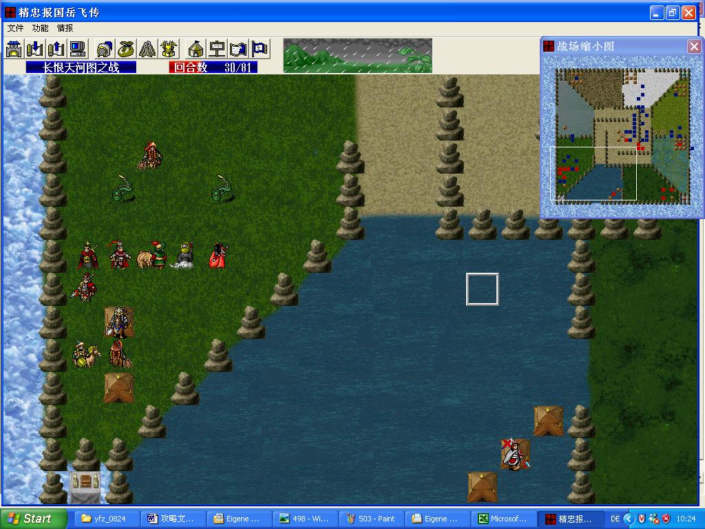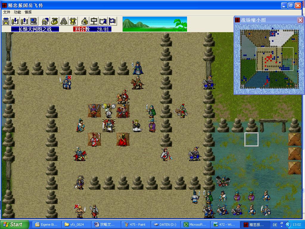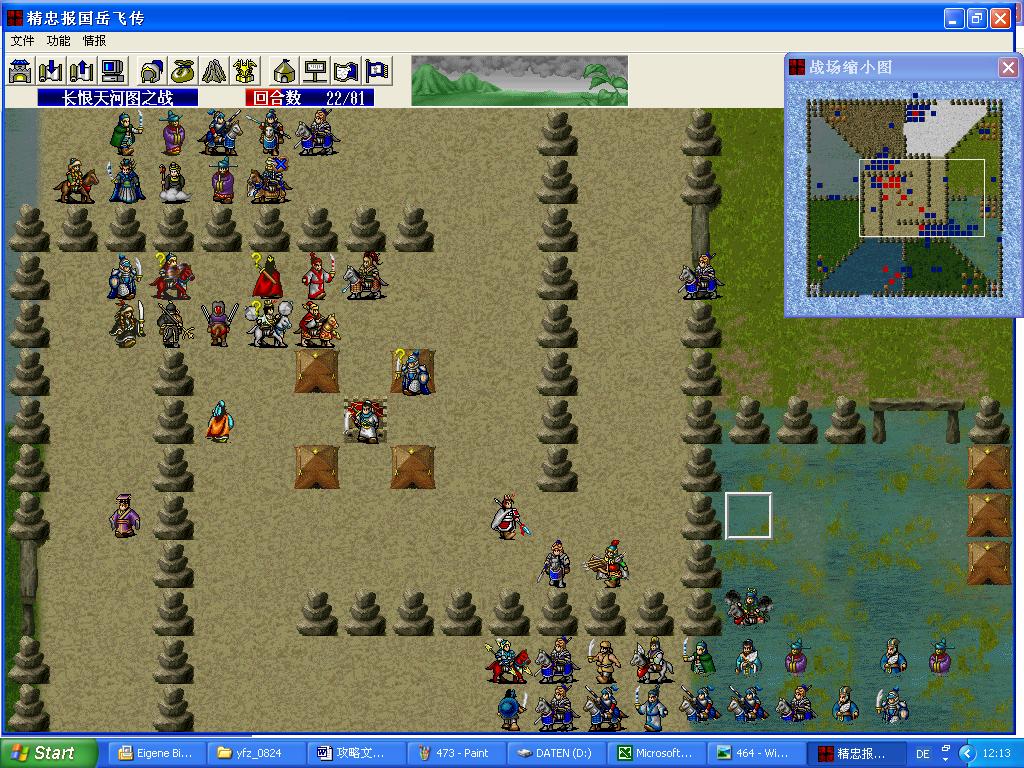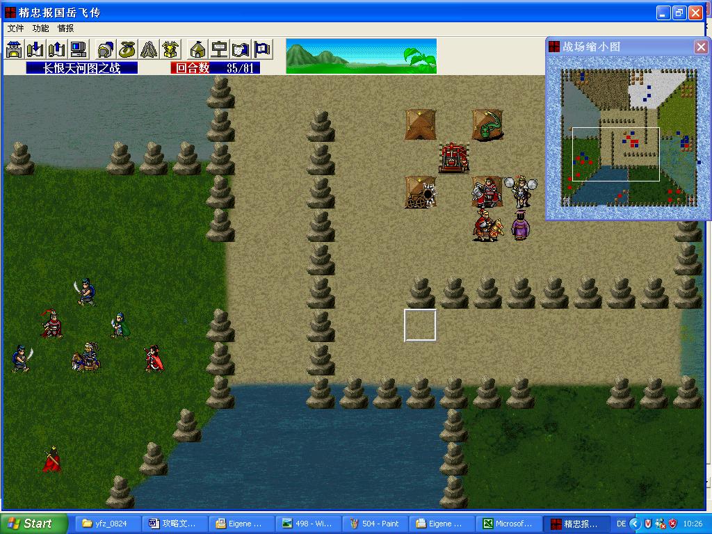先声明,本人下面攻5阵的打法仍然不够巧妙。理想的打法应该是,不去强攻任何一阵。现在回过头来想,应该在此之前,先让金兀朮的西路和岳飞的北路留在北西两甬道内,诱使5阵的8个敌军全部进入甬道。然后再让牛皋的南路由西甬道攻入5阵,牛皋单挑高宗后击退之占住遏制复活点,那样5阵就告破了。不过这种思路下要求牛皋一路要拥有更强大的力量,不想再重头调配了,只好硬攻5阵。