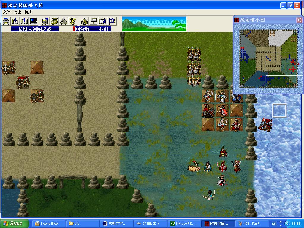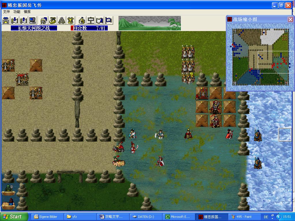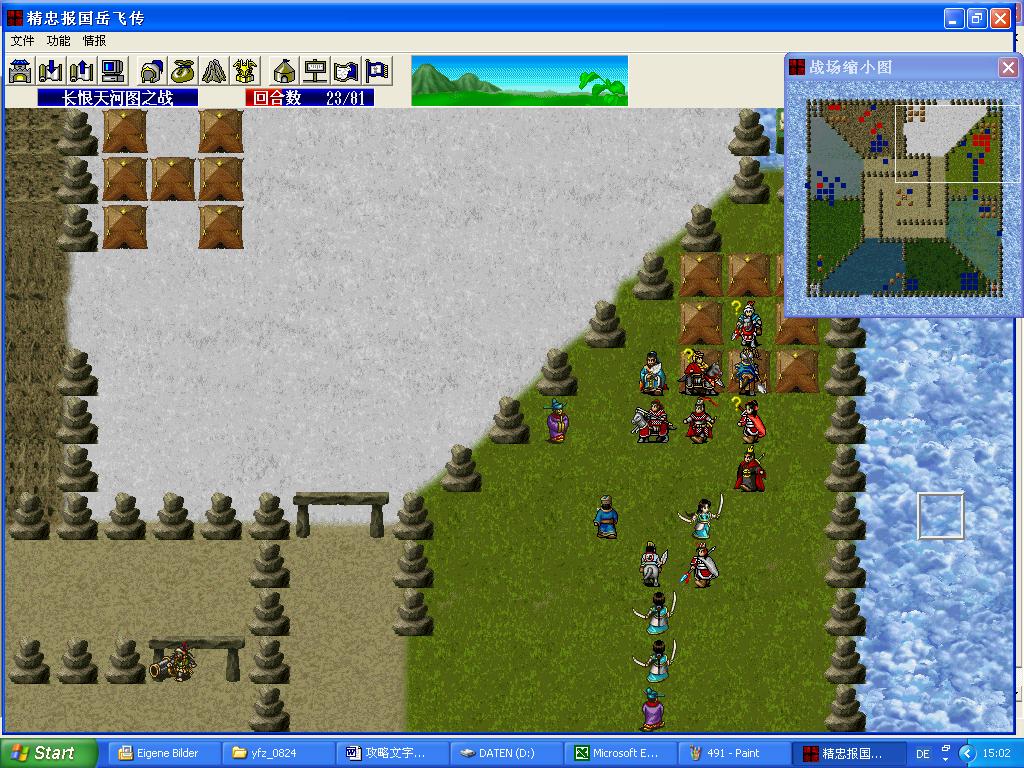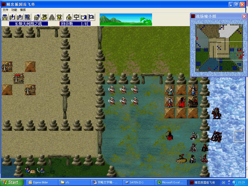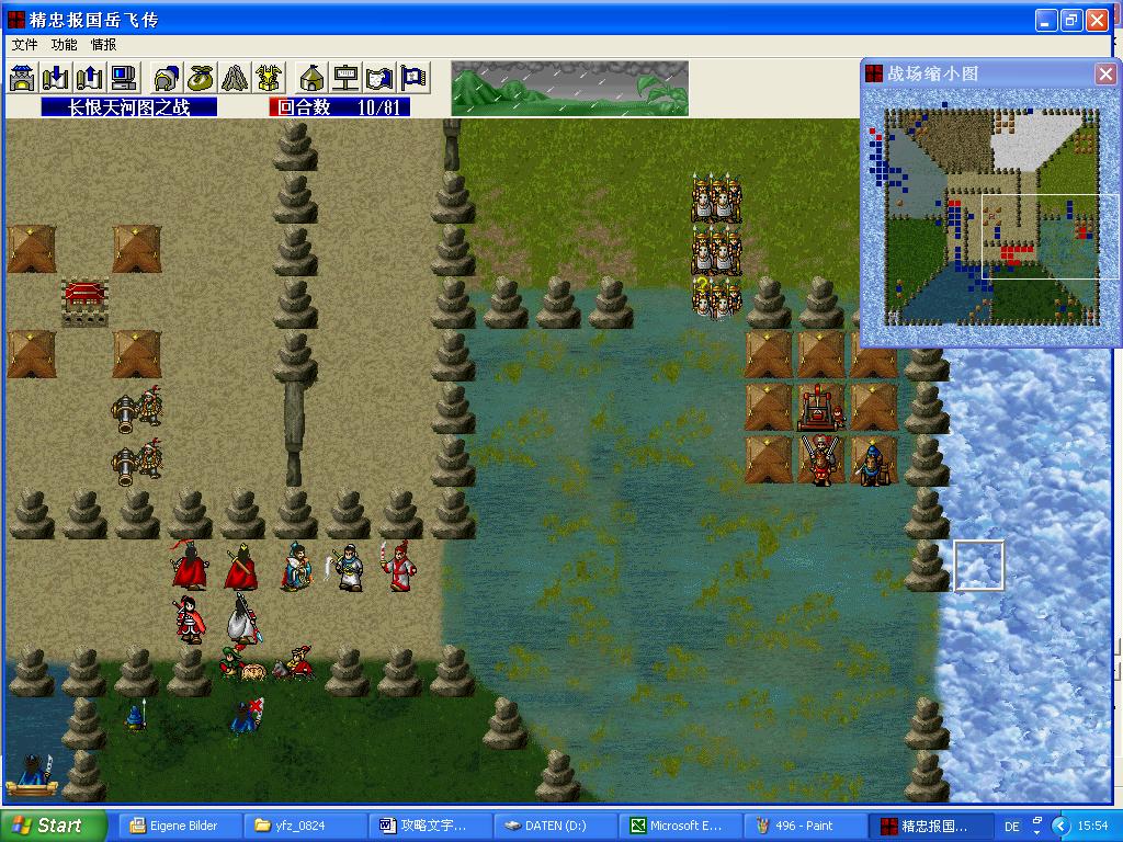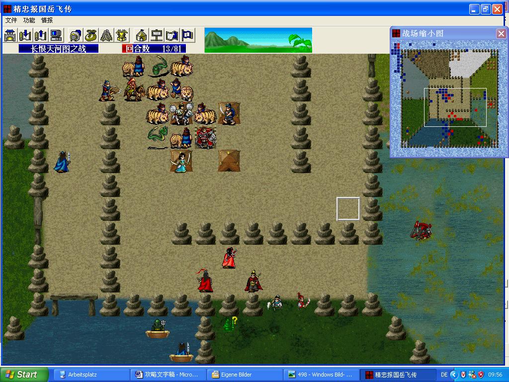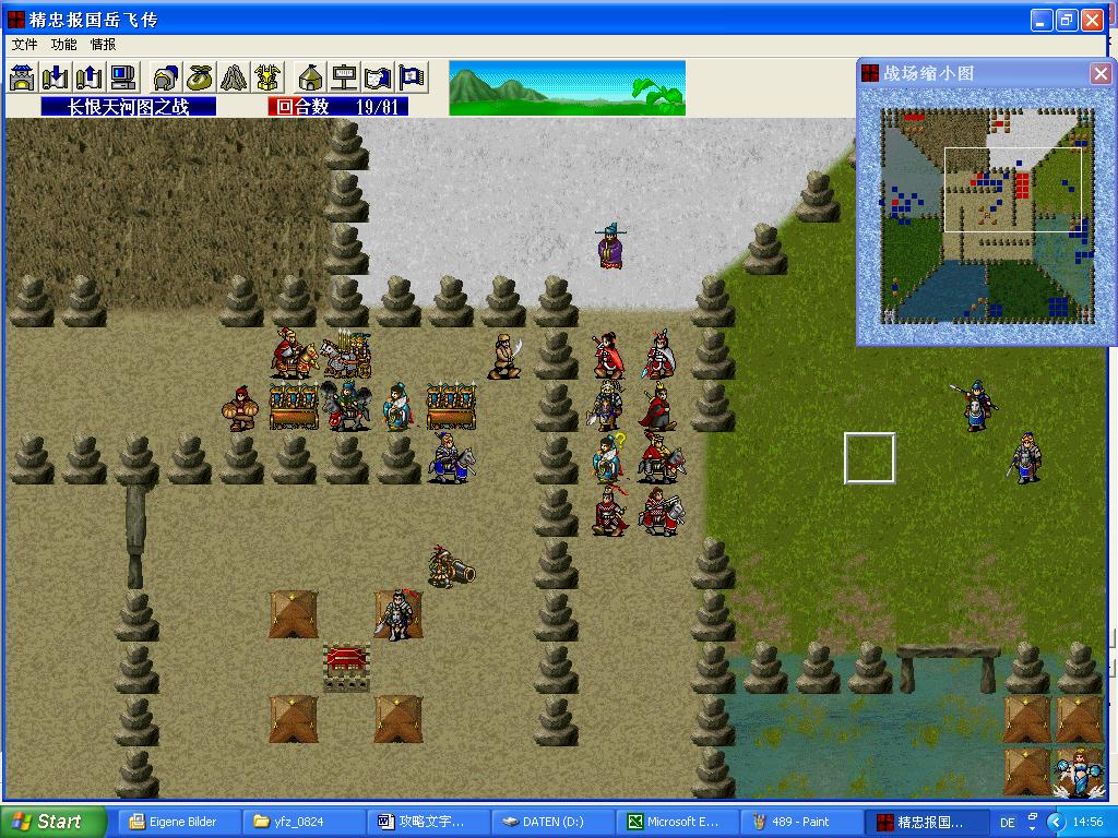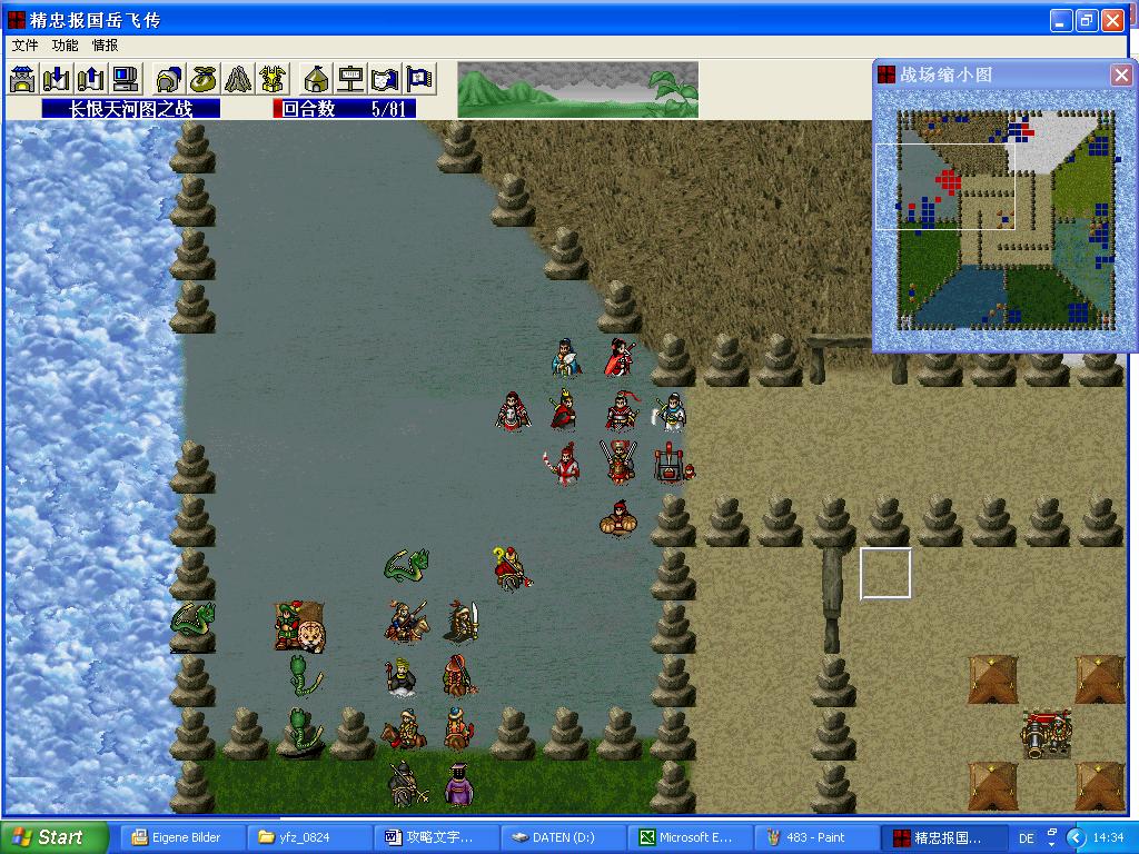 先声明,本人下面攻5阵的打法仍然不够巧妙。理想的打法应该是,不去强攻任何一阵。现在回过头来想,应该在此之前,先让金兀朮的西路和岳飞的北路留在北西两甬道内,诱使5阵的8个敌军全部进入甬道。然后再让牛皋的南路由西甬道攻入5阵,牛皋单挑高宗后击退之占住遏制复活点,那样5阵就告破了。不过这种思路下要求牛皋一路要拥有更强大的力量,不想再重头调配了,只好硬攻5阵。