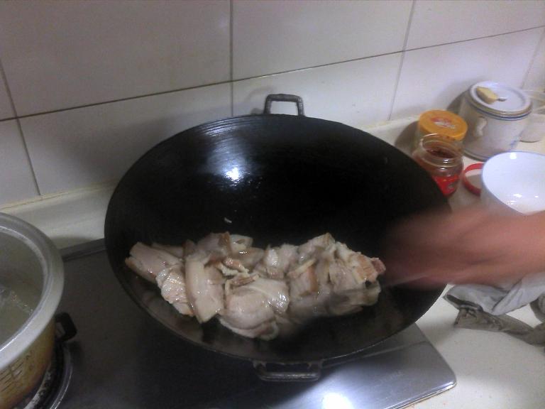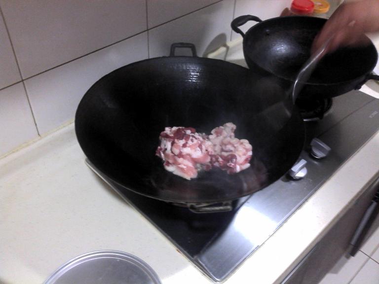 3. 待五花肉中的油炒出来,同时肉片略微有些卷曲为好