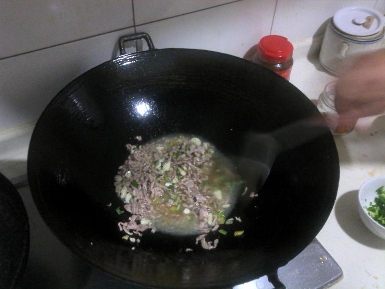 2. 在锅中放少许油并烧热后(如果肉比较肥也可不放油),下切好的肉片煸炒
