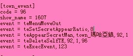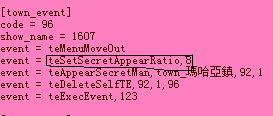 只将8改为100的话,必须要等到玛哈亚镇才能让它出现,如果将"event = teSetSecretAppearRatio,100"这句挪到米兰多的 ...