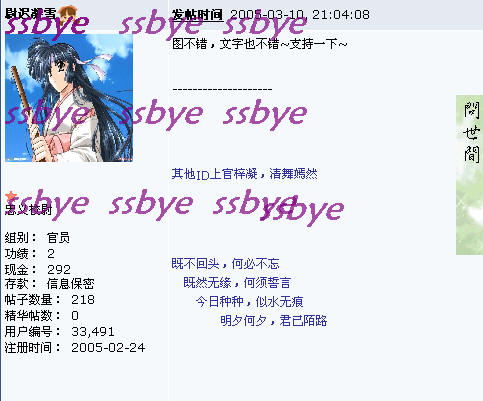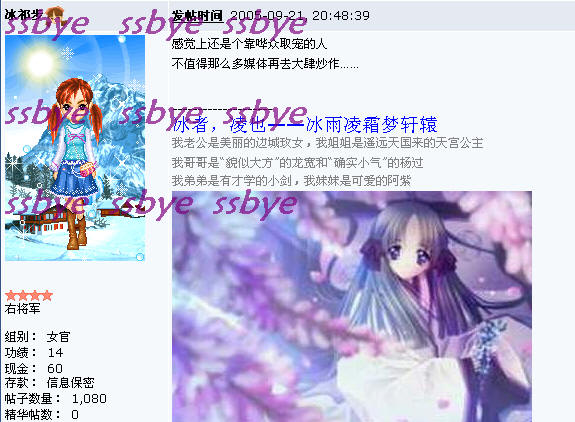 刚刚开始混论坛啊,什么都不懂的,头像签名都不会弄,所以看上去光秃秃的