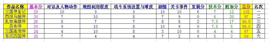 对话及人物动作、地图利用程度、战斗系统设置与难度、剧情、关卡事件(伏兵,援军,AI变化,障碍设置,魔法设置,单挑等)。每项10分。另外10分发展分,对此5项中有亮点的作品再加分。