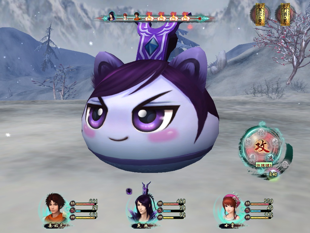 2)敌方只有两人,各个击破是王道。柿子捡软的捏,明显之前打过一次的上官公子要弱上好多。上来俩人应该有80以上的气(别告诉我你在进山庄前把气用光了),连开两轮大,上官公子立马只剩血皮,风法两三下放倒了事。