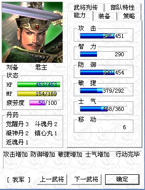 (p.s. 1、镇心丸在原功能基础上增加一个功能,我方是疲劳过高时可恢复疲劳,电脑带着则意义更大,每回合恢复的疲劳值=镇心丸数量;2、敌人也会携带丹药,例如虎牢关的吕布带有单挑的两丹和觉醒丹,打起来更不简单。还有,关于单挑秒杀,敌我都是在有单挑2丹其一时才能防秒杀,也就是说,即便敌人是无双武将,只要他没丹,一样有可能被秒)