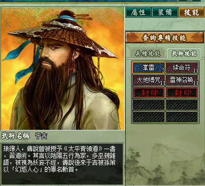 按说我军已经有简雍糜竺两个医生,可两个大叔怎么比得上美女太后呢,医生是不可缺少的兵种,像何太后这种既养眼又实用的队员,自然是多多益善。买不起华佗和张医生的玩家有福了 。何太后的四个天赋技能为无惧、真御咒、剧毒、捆仙风(有说她带仁心的,反正我没见过)。对医生而言,攻击技能没什么用,个人觉得捆仙有没有无所谓,留着位置打书比较好。