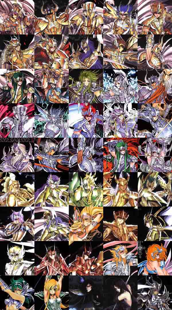 第一排:白羊座穆--金牛座亚鲁迪巴--双子座撒加--巨蟹座迪斯马斯克--狮子座艾欧里亚