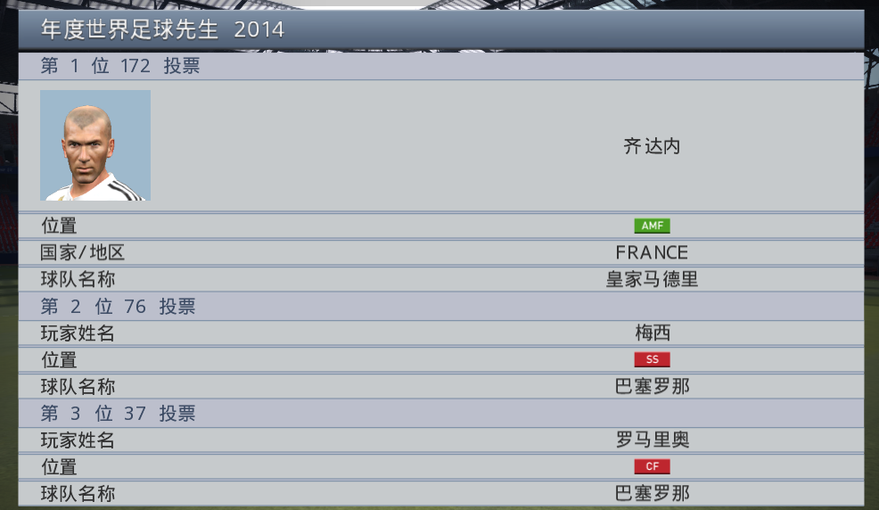 欧洲足球先生被回归皇马的齐达内力压c罗梅西获得