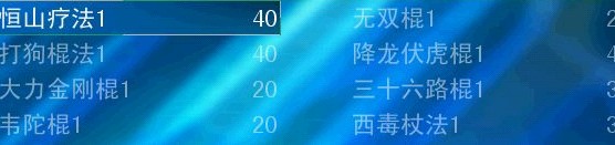 棍枪:韦陀棍(京城武馆购买)、西毒杖法(20级聚贤庄买苹果种子再去田地种两个苹果交给大理门口猛汉>重阳宫门口接去古墓杀20个绿林隐士任务〉破庙击败欧阳锋,带毒、盲目)、三十六路棍法(雪地迷宫左边)、大力金刚棍(少林寺藏经阁,带盲目)、降龙伏虎棍(扬州布告栏扬州郊外盗匪任务)、日月一击枪(拿到倚天屠龙记后进明教分舵迷宫右〉下〉下拿到,带麻痹)、打狗棍法(桃花岛完成黄蓉任务得,3级群攻6个)