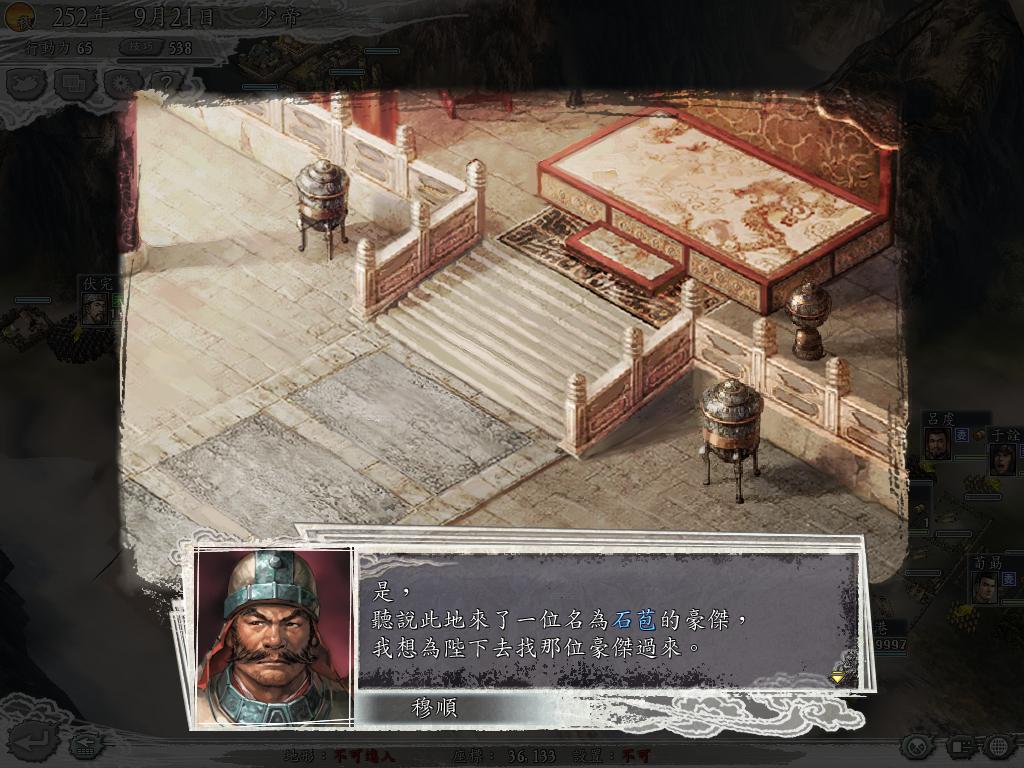 4、初始给少帝1w金,8w粮,10w兵,位处永安,和刘备交好,但没结盟(和大耳结盟要和诸葛论战的,派去的人直接被秒