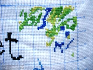 我考虑了一下觉得要是按照以前的想法,等都绣完了一起勾边,很有可能有哪部分没注意就没勾上的情况出现。所以改变了一下方针策略,决定还是从角上开始绣好了。不过其实是,左上角已经绣好一部分了,右上角几乎没怎么动,但是整个右半部分的进度要远远快于左边。所以考虑了一下还是从右上角开始好了。