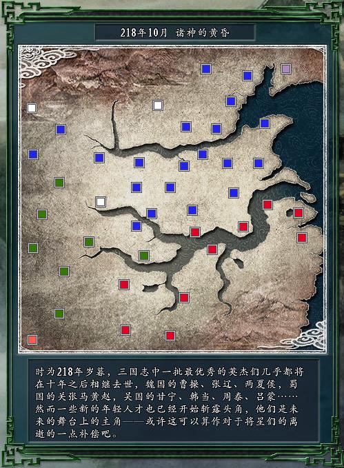 时为218年岁暮,三国志中一批最优秀的英杰们几乎都将在十年之后相继去世,魏国的曹操、张辽、两夏侯,蜀国的关张马黄赵,吴国的甘宁、韩当、周泰、吕蒙……然而一些新的年轻人才也已经开始斩露头角,他们是未来的舞台上的主角──或许这可以算作对于将星们的离逝的一点补偿吧。在本剧本中,一批名将在十年内陆续的去世,可以使大家尽情体会到英雄末路的悲壮和新人才养成的乐趣,同时使一些在之藏匿于英雄的光辉之中的年轻武将得到玩家的重用~~~- -+ 好了,废话不多说了。。。首先了解一下在这个剧本中哪些名将会很快去世: