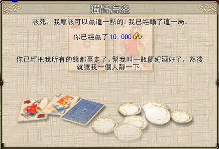 当我的视线落到城里唯一的酒馆上时,我知道机会来了。酒馆角落里的独臂海盗满脸坏笑的想要和我玩牌,这个蠢货必定以为我像我的长相一样好对付。而我将所有的五千法郎都压上后,凭借高超的技艺很快就赢回了双倍的筹码。