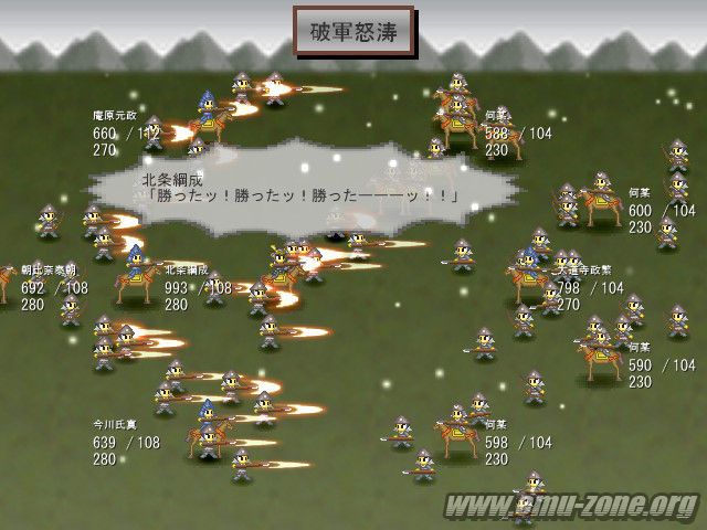 合戦で勝利したり、外交で敵を支配下に置いたりして、敵対するすべての大名を恭順させ、天下統一を果たせばゲームクリア。牢人の場合は「合戦」ではなく「城取り」となり、現在いる城に攻め込んで勝利すると、城が手に入って大名になることができる。