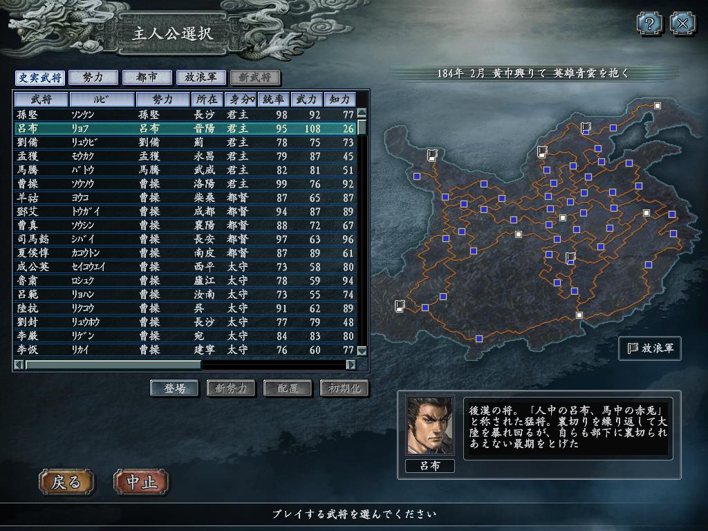 刘备、孙坚、马腾、吕布、孟获 5支放浪势力。(剧本中最多5支放浪军)