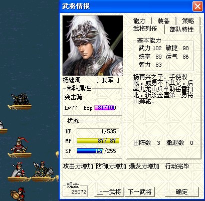 第二个出场的是超级酱油男,岳云大少爷,为啥说云少是超级酱油呢,因为这一关,他唯一的作用就是用特技“驱逐”,帮忙抢占左下角鹿岩,所以先让他到中间鹿岩处,把SP升到100。云少出场位置较远,需要有人跟他加个强行。为了保命并容易获得SP,给他拿铜锤。其他人过来后,不要挨着云少,避免影响铜锤的功能,也不要站在步兵和鱼鳞军的攻击范围内,保证他们攻击云少。
