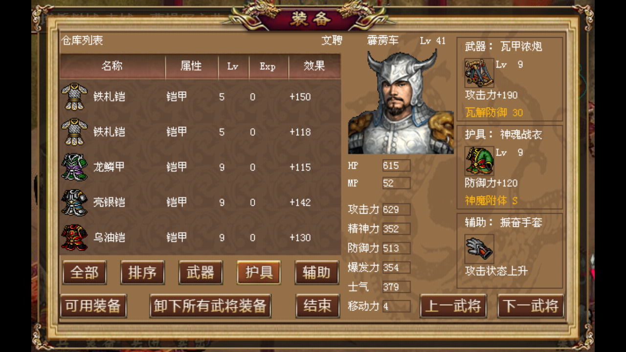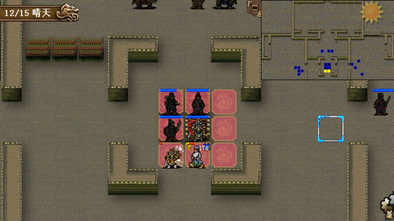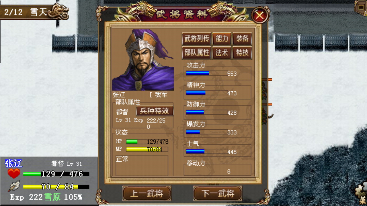 这里先说一下爪机版相对PC版几个和能力状态相关的装备的一些变化,战场上中途出场的援军装备煌光盾、振奋手套这类buff道具出场的首回合是无法获得buff的,这里第三回合出场的徐晃装备的煌光盾要在第四回合才能起作用;八卦宝衣除了能够解除异常状态之后,还能消除能力下降的debuff(包括五围能力,移动力);后面得到的亮银铠、雌雄剑、明光铠没有了PC版反弹或转移异常状态的能力……