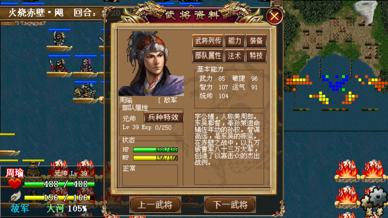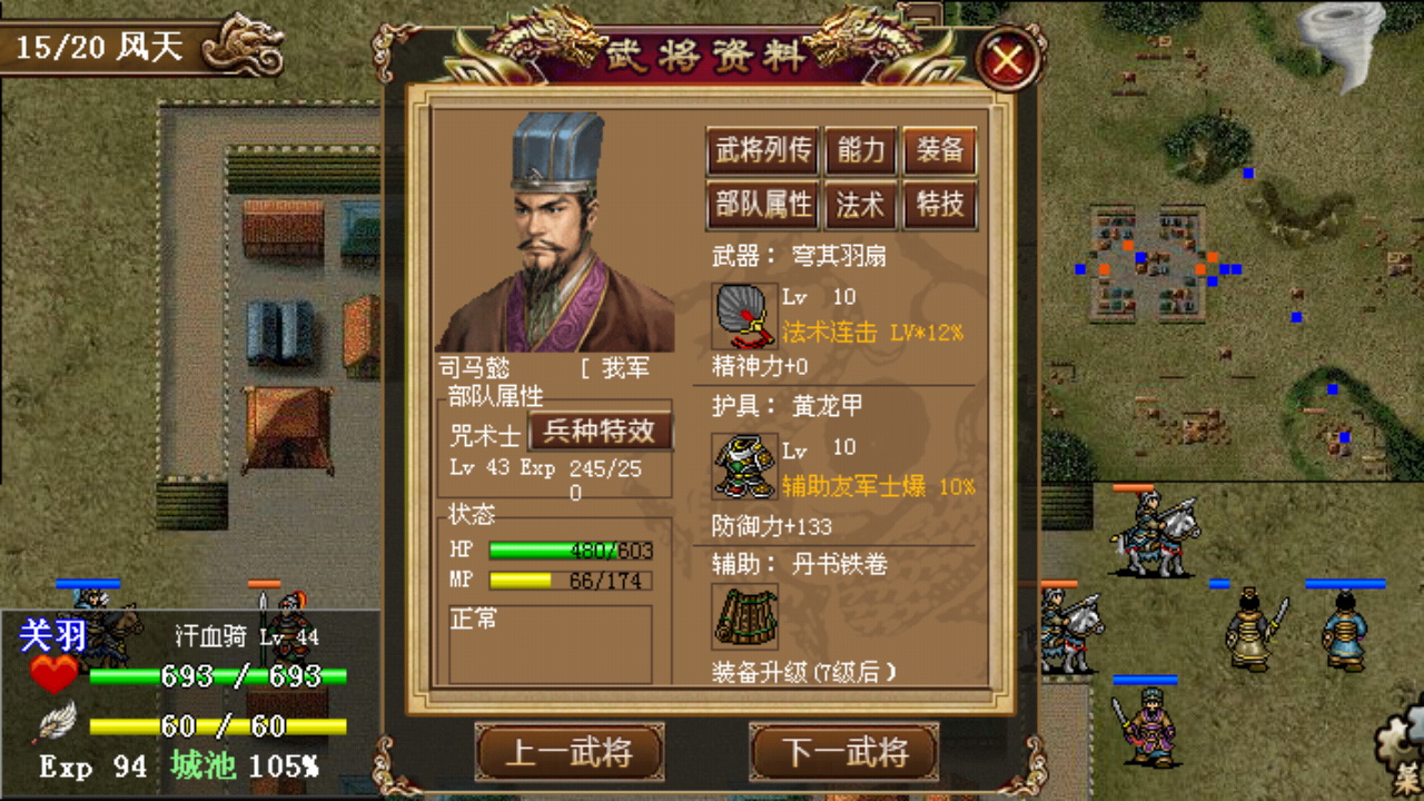 水路物理拆卸和法术狂轰威力强劲,第5回合便拆完所有井栏完成登陆,进展相当顺利;陆路由于退守营地直到第7回合才有机会干掉朱桓,朱桓长时间的光环补给无谓的消耗战相对多一些。最终10回合完成全灭,和敌军的弓兵群一直纠缠到最后的于禁凭借大量的反击经验升了整整3级。