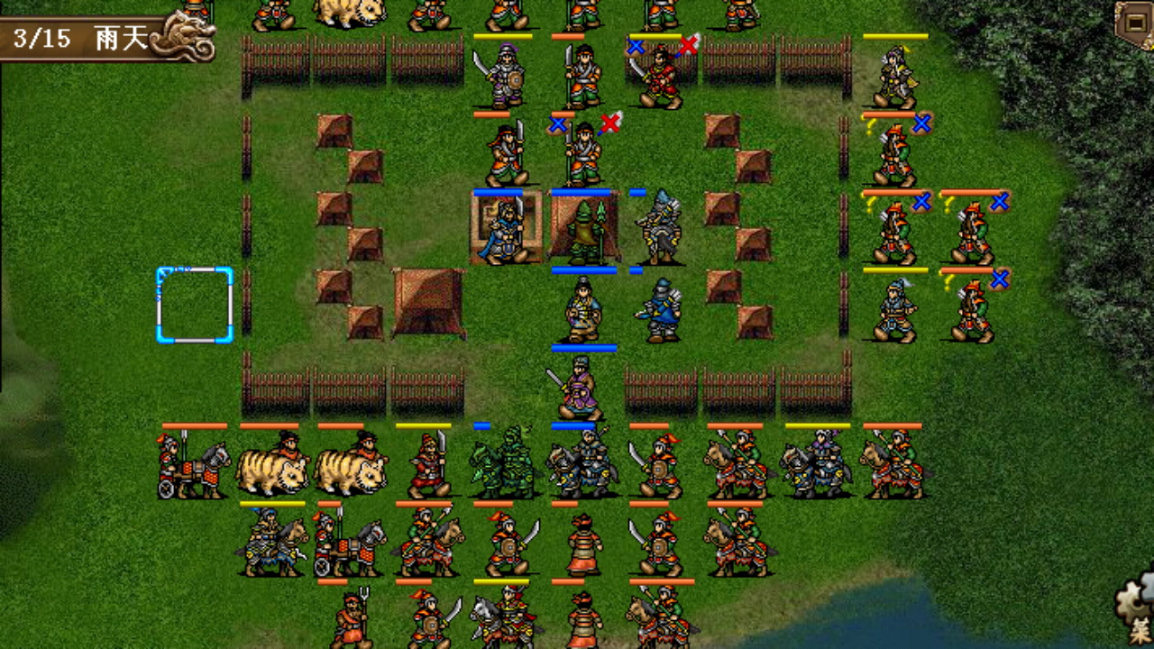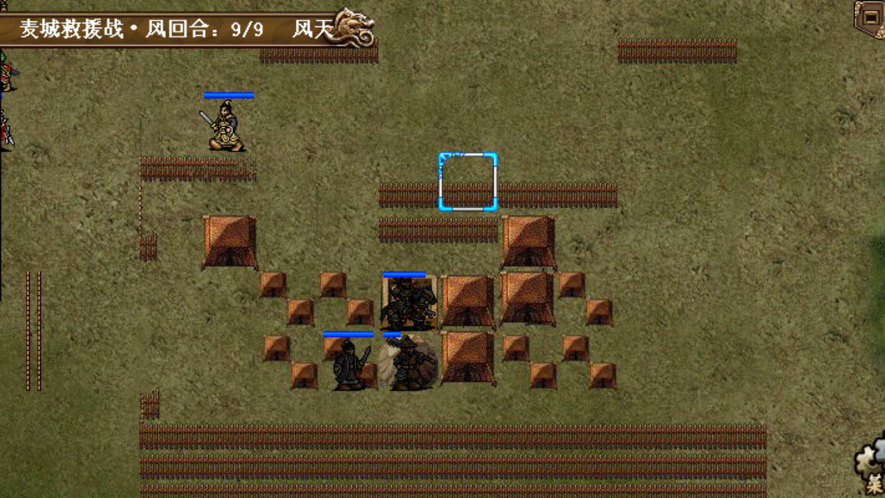 这一关的思路是合兵,曹操、曹洪、典韦逃出大营在敌军大营西侧的河畔和援军会师后再合力反推,这样可以充分利用荀攸的光环和法术补给,解放全队的战斗力。开局如下第二回合图所示,曹操三人逃到大营南门口,曹操曹洪站在门口的上方,曹操给自己加速,典韦绝影打完胡车儿之后跑到左边的民居确保不要被胡车儿攻击到,三人注意不要越过栅栏那条线,否则外面的敌军会主动出击围住曹操三人,那样的话整个逃跑计划也就泡汤了,敌方回合依靠洪神的反弹可以对双戟胡车儿造成不小的伤害,这是快速消灭胡车儿夺回典韦的武器重要的一步;第二回合援军过河徐晃堵住大营的西门,夏侯惇吸引下面的武术家和贼兵上来攻击,曹操往左边武术家和贼兵的方面移动卡位,典韦攻击左边的贼兵后再往回跑卡住张绣胡车儿的追兵,曹洪先龟缩在曹操和典韦中间,避免诱发左边的贼兵和武术家的攻击;接下来曹操可进一步西进卡住武术家往下方和右方移动的线路,并对典韦进行补给,在消灭作为合兵障碍的武术家和贼兵之前,典韦还是要继续卡位挡住右边追击的敌军,洪神攻防乏力而且曹操也无力再对其进行补给,因为要达成三光的目标,也不能自行吃药,所以还是暂时先往下方走避开敌军的攻击范围求自保就行了;大概第4回合消灭了贼兵和武术家之后,就能合并一处,扎堆防御和补给了,这时候就没有什么难度了,稳打稳扎,先杀死胡车儿夺回武器,适当利用曹洪反弹敌军的远程,慢慢开始反推,最终14回合全灭过关。
