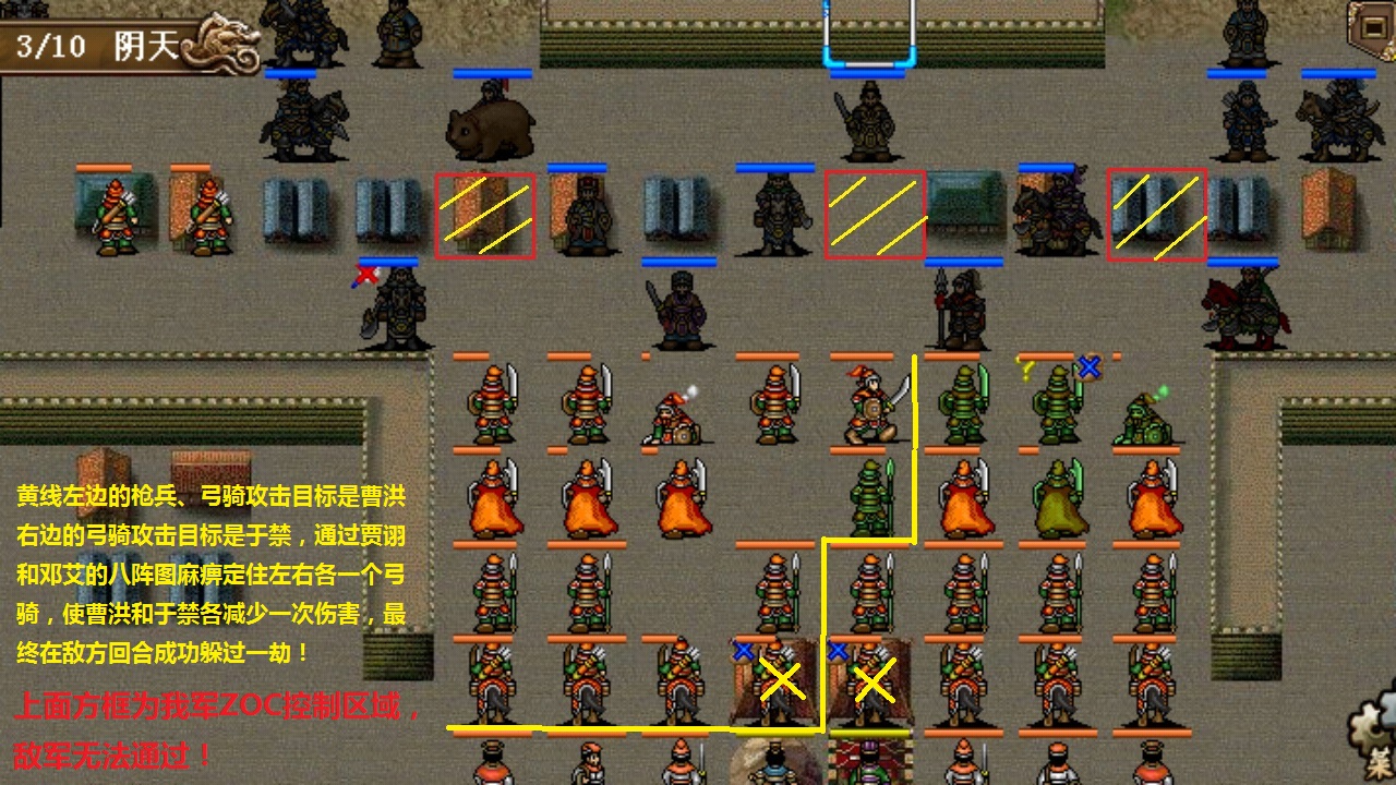 这一关要打好的话对AI行动,配装和仇恨控制,卡位站位的要求非常高,打法脱胎于野夫的神秘马甲阵,但是由于手机版乌骓马及其他地方的一些不同,需要大量的改装变阵,这一关可以说是楼主豪曹手机版的呕心沥血之作,从战前配装到战场走位都力求达到最优的效果,感觉还是干得比较漂亮的,最后按耐不住用手机软件录了小段视频。最难处理的一回合应该是第3回合的合兵,由于和敌军内城守军全面接触,敌方回合防守压力山大,最终费了好大劲才想出办法hold住场面。由于有视频和详细的图片讲解,后面就无需多言了,最终6回合全灭过关。