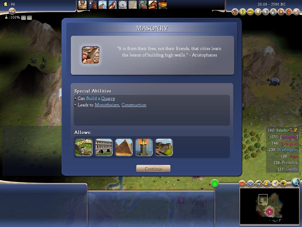 科技方面,按惯例是青铜优先的,不过看看这副图,食物实在是短缺,自然成长的话恐怕得NN年后才能利用上大理石,权衡再三,还是首发动物驯养了:
