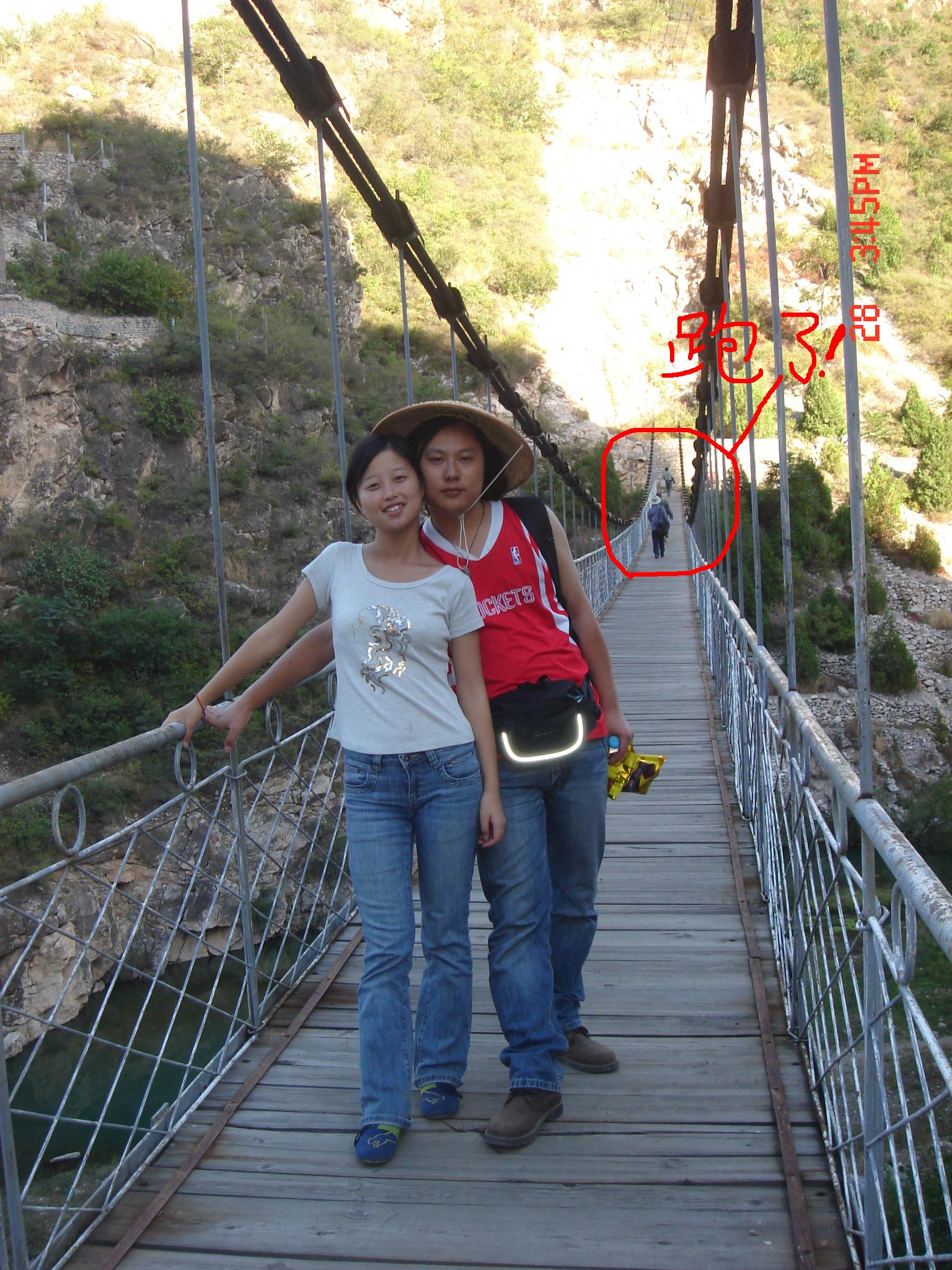 当我们磨磨蹭蹭地走到吊桥时,老头迎过来售票,当我们刚收好票据,准备拍照的时候,他和一个保安还有一个什么人就急急忙忙地跑到吊桥下面的小船上划船跑了,真让我们怀疑他是假的……