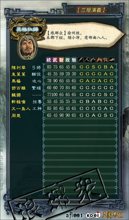 列传文件:S11MSG02.s11,包括剧本武将列传,宝物说明。复制到“游戏安装目录\media\msg\” 下。