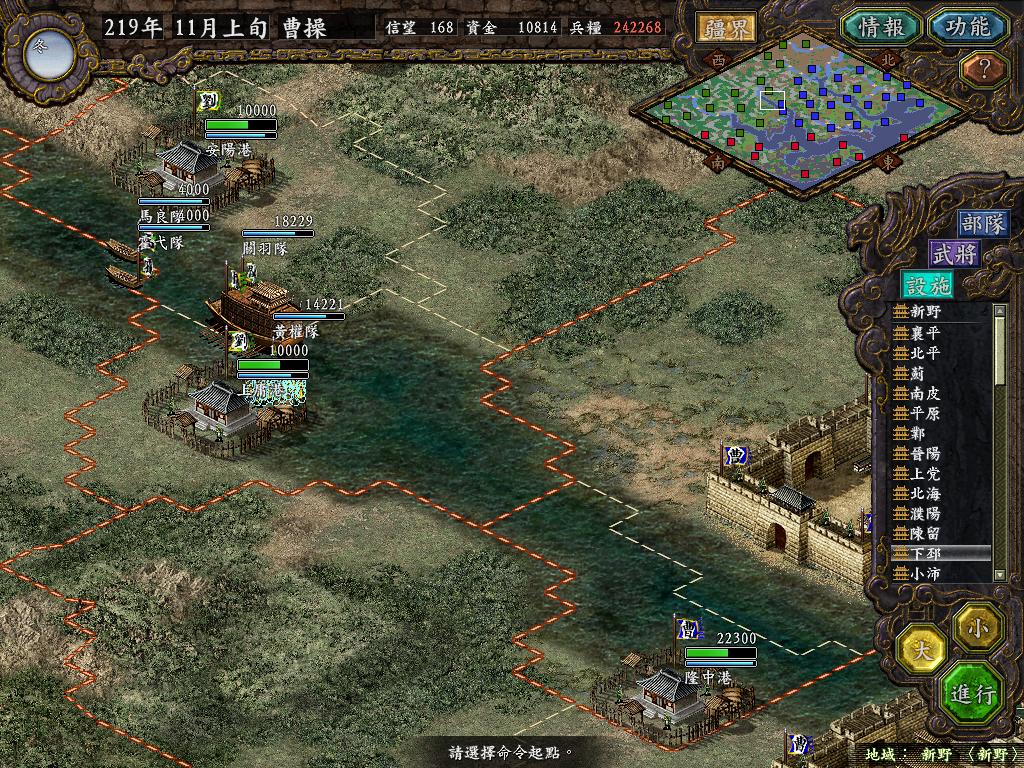 为了准备战役,隆中,新野兵力只有基本守备队,和威慑性的武将镇守,所有预备队都用完了.等待北方2W的丕儿赶到.