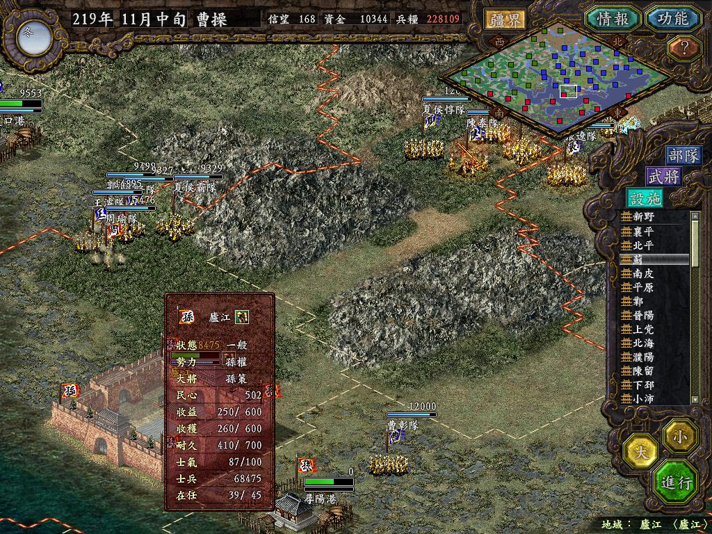 由于此剧本大大削弱了兵法的威力,兵力就显得更为重要,另外信望优势也没有那么明显了,因此曹操初始多的20W兵力对另两家构成的威胁是不是太大了?!尤其作为吴国,要防守的地方太多,兵力很难集结,武将也没有蜀国五虎 ...