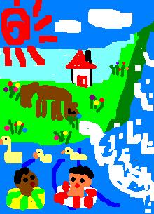 这一作品展现了新时代下,各国人民和平共处、友好向前的合作精神。画面上两名小男孩(认为他们关系是BL的自己撞死!),一个是中国小朋友,另一个是非洲小朋友。他们团结互助,共同在大自然里搏击,展现了人文奥运的深刻内涵!旁边的小鸭子、骏马、瀑布、蓝天、草地,表现了人类居住环境的不断改善,更从一个侧面揭示了我们美好的地球村!