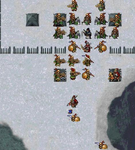 岳云(7级紫金锤 6级柳叶甲 乌骓马)冲过去后用紫金锤可以晕一个弓手和一个武术家(第5回合主动攻击+防御反击)柳叶甲保证云第5回合落浅滩不被弓手射死;乌骓马在这关的作用就不用我说了,大家都知道。