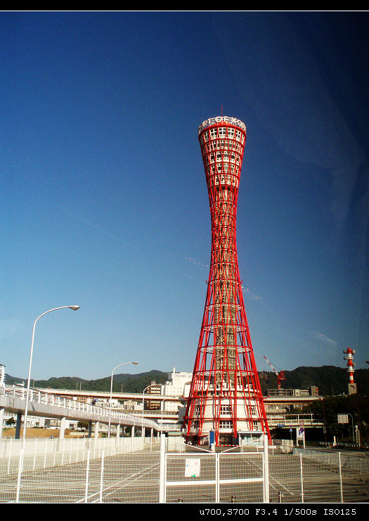 于车窗内拍了一张神户港的港口塔,因车窗的关系,右侧的天空由浅蓝过渡至深蓝,甚有况味。