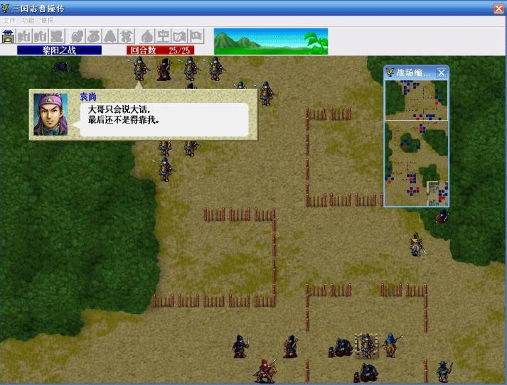 第一回合,典韦凭借爪黄之力,进入区域(0,0)-(19,28),也就是越过第一道栅栏,引发栅栏里的7名敌人主动出击,曹操引一个弓兵,不要让他挡典韦北上的路,张辽引那个步兵,曹仁往上走准备过栅栏,其他人往袁谭所在的城里走。