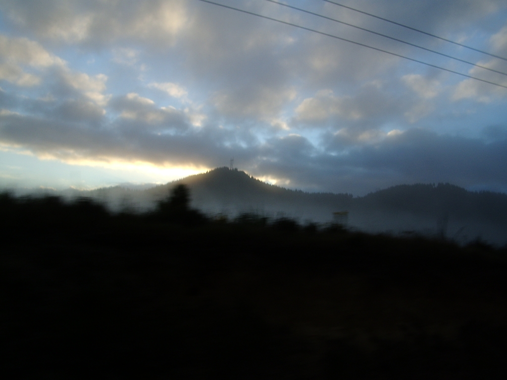 才只有5点,天气还真的好早,外边还黑黑的。在大约开出门半个小时后,天色渐渐转晴,晨光和雾气连在一起,形成了一片很美的景色