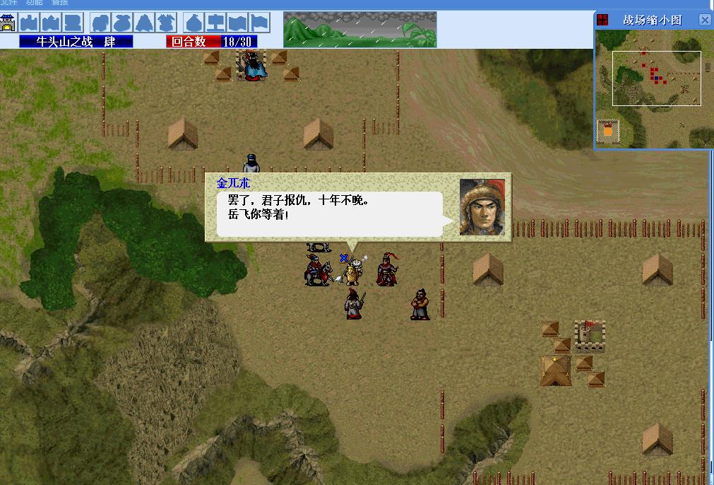 不小心触发了老牛VS兀术。 拖到20回合结束战斗。 有个问题,就是老牛已经挂了,战斗结束的时候,老牛还会对岳帅说日后不免要相见