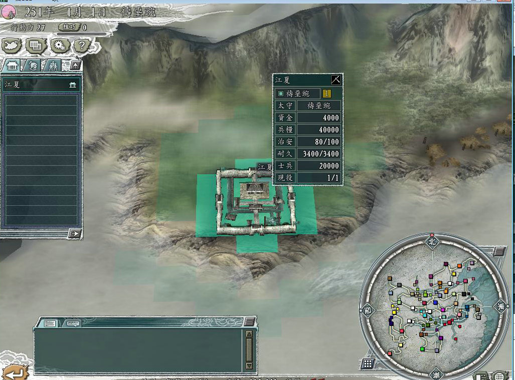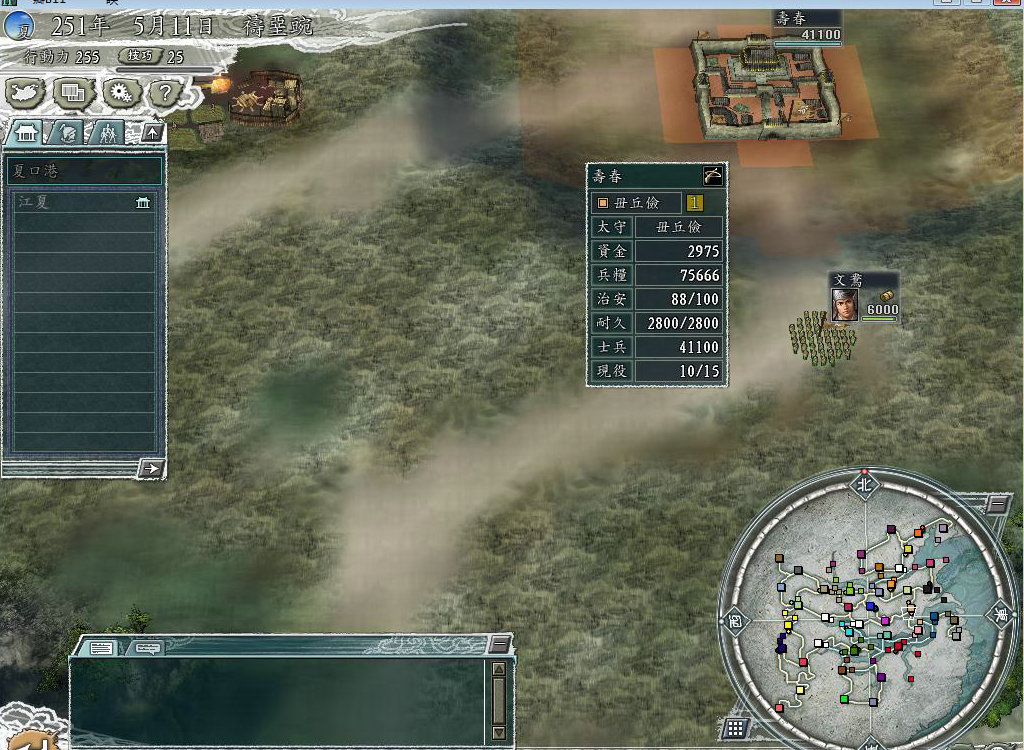 二:拉上运输队,带上 11000兵和所有兵器,带上大部分粮草和金钱,不巡查,其他什么事都不做,要知道时间非常紧啊,六一居士,连建个黑市都要100天,天底下没有比他更烂的,出征贼兵都会被贼兵给晕了。运输队直奔永安的港口巫县港,之所以选择永安是因为三国11中只有永安最容易守,我是说除了在极东极北这些城市外,在大地图中间的城市中,永安最容易,东面不管是谁,建个阵就基本上没有人能够攻的进来,对于西面,势力非常低,西面的邓艾,刘虞等等相对于刘备曹操孙权来说 就是小菜。