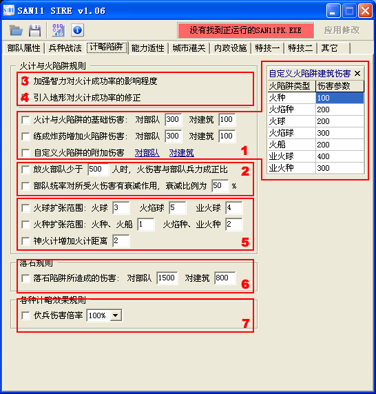 1. 基础火伤害、火陷阱伤害、火科技附加伤害参数(包括对部队和对建筑)都可自定义