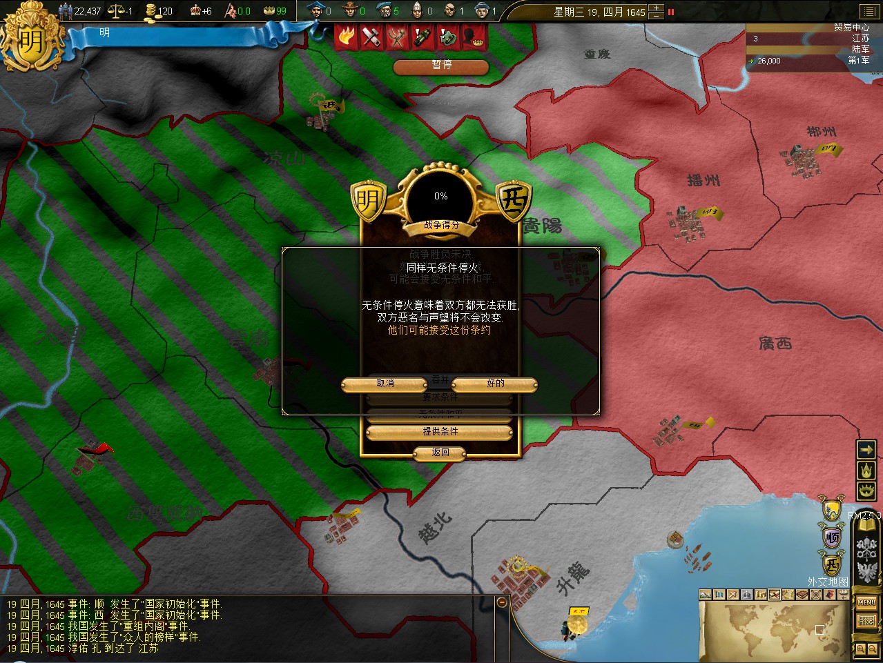 常例开局。话说三个南明剧本 1645 1652 1659,都相当BT。尤其是1659剧本,基本是不可能的任务嘛。1645剧本和1652剧本比较,1652剧本把张献忠的地吞了,兵略多些,还有个BT的李定国,但是1652剧本的南明有两个致命的弱点。一是东面被建奴占了一大片领土,这让我军无法迅速的以最小的代价来与建奴议和。二是江苏丢了,没有了江苏,经济上此消彼长,相当头痛。